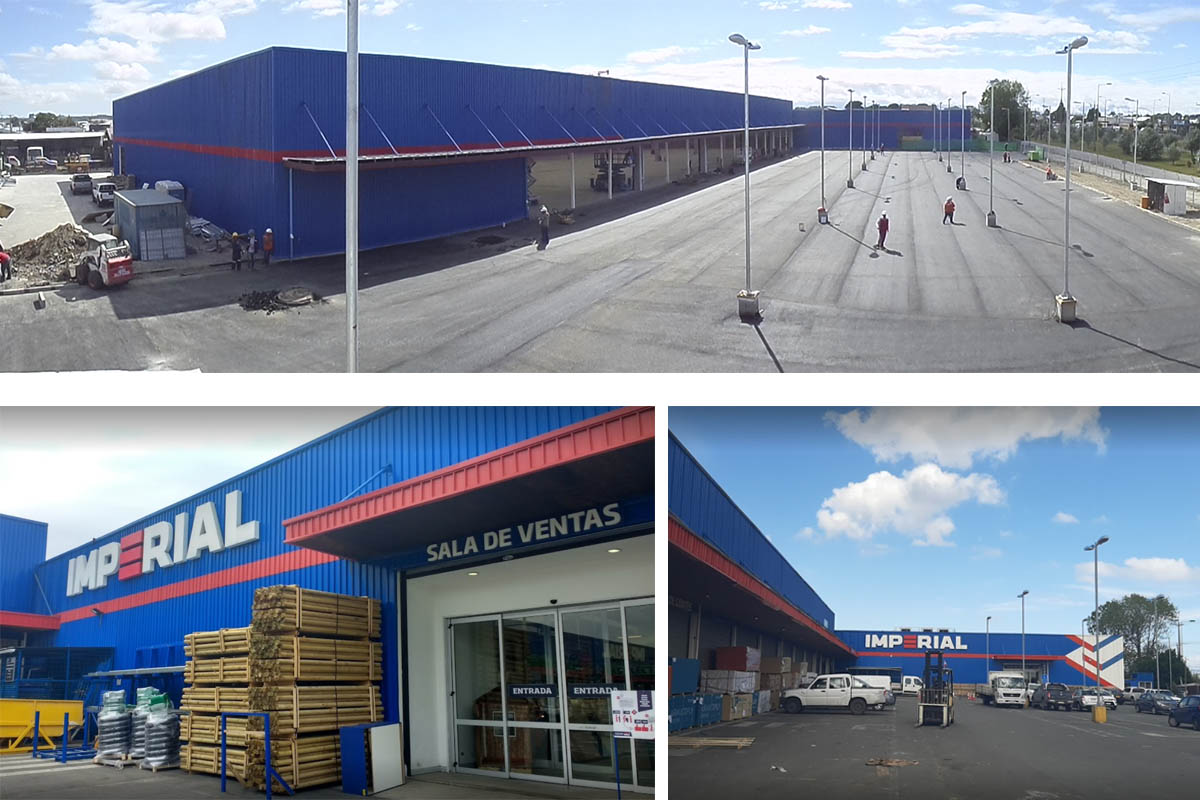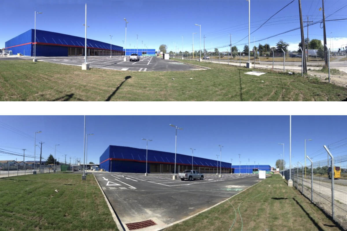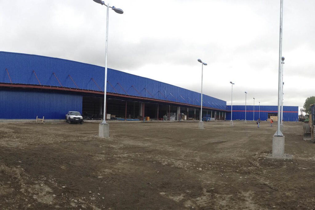 Construcción de galpón de 6.700 m², con pilares prefabricados, estructura metálica de cubierta y revestimiento, pavimentos industriales y obras exteriores. La habilitación de la tienda la realizó el mandante.